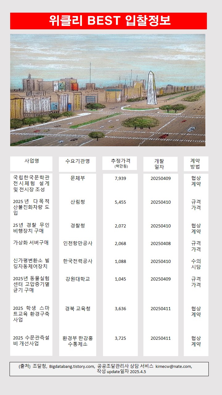 | [용역 입찰 동향정보] 조달청 용역 위클리 ('25.04.07-'25.04.11) 입찰 동향 (1) | 2025.04.06 |