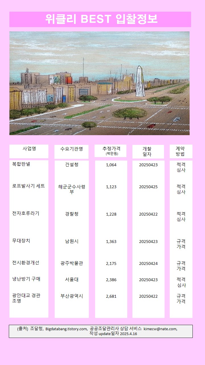 * 본 정보는 시설,용역,물품 등의 입찰공고를 위클리 임의 추출하여 제공됩니다 (기업에서 입찰참가 여부를 1차 모니터링 할수 있도록 기업이 원하는 특정분야의 맞춤형 입찰정보를 서비스 합니다 (문의 010-4705-9239)